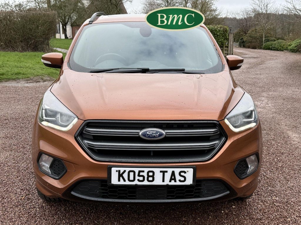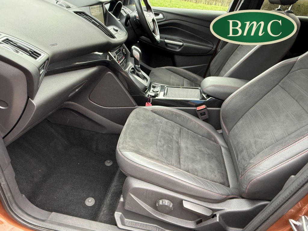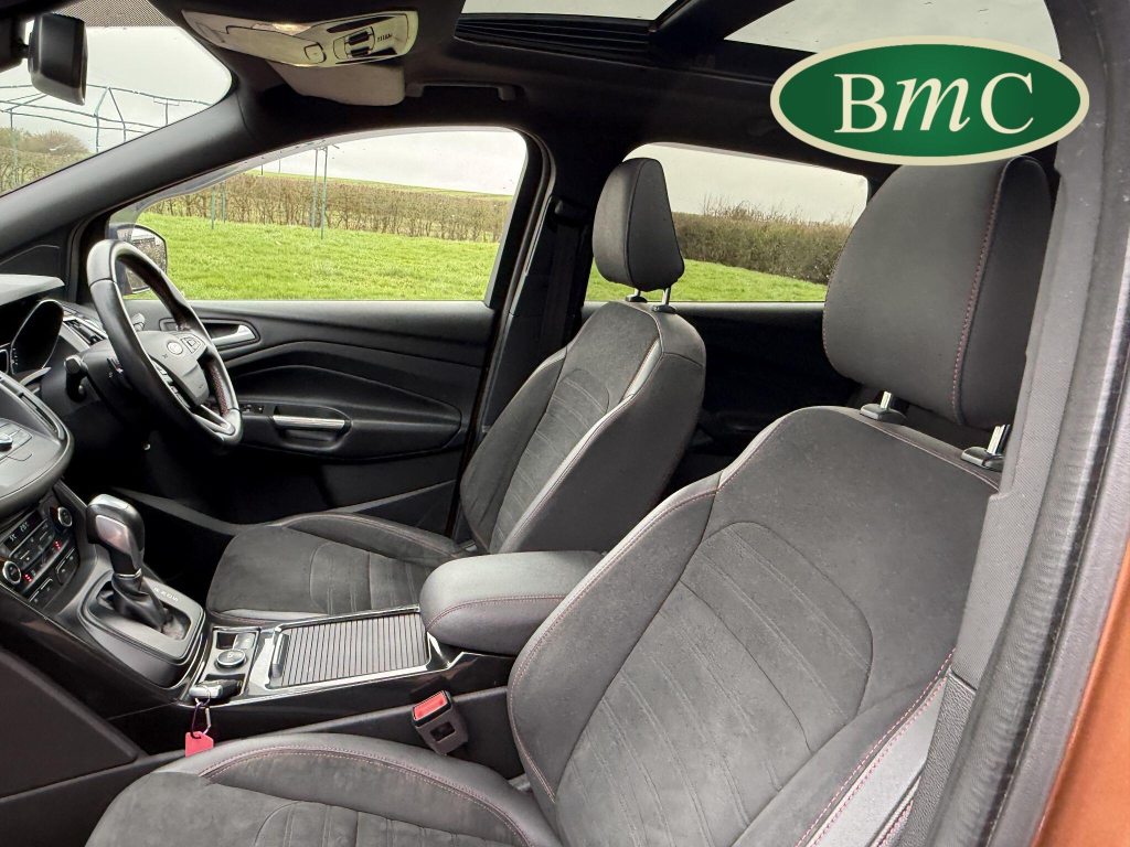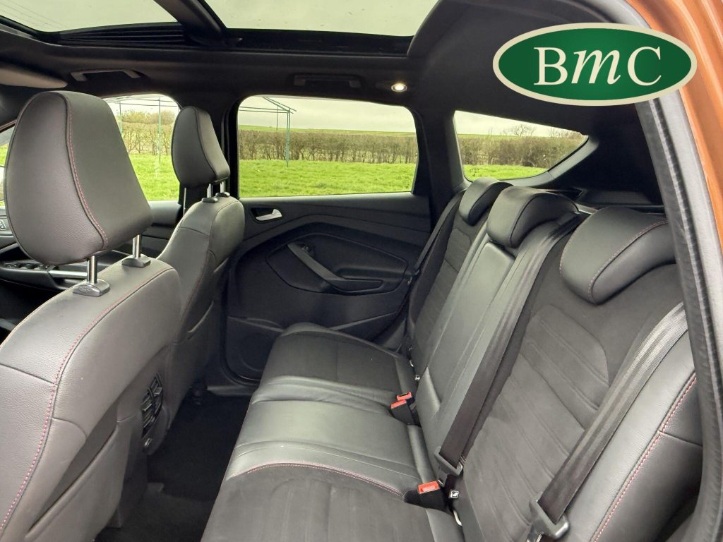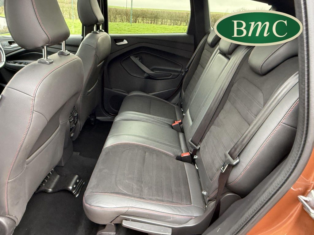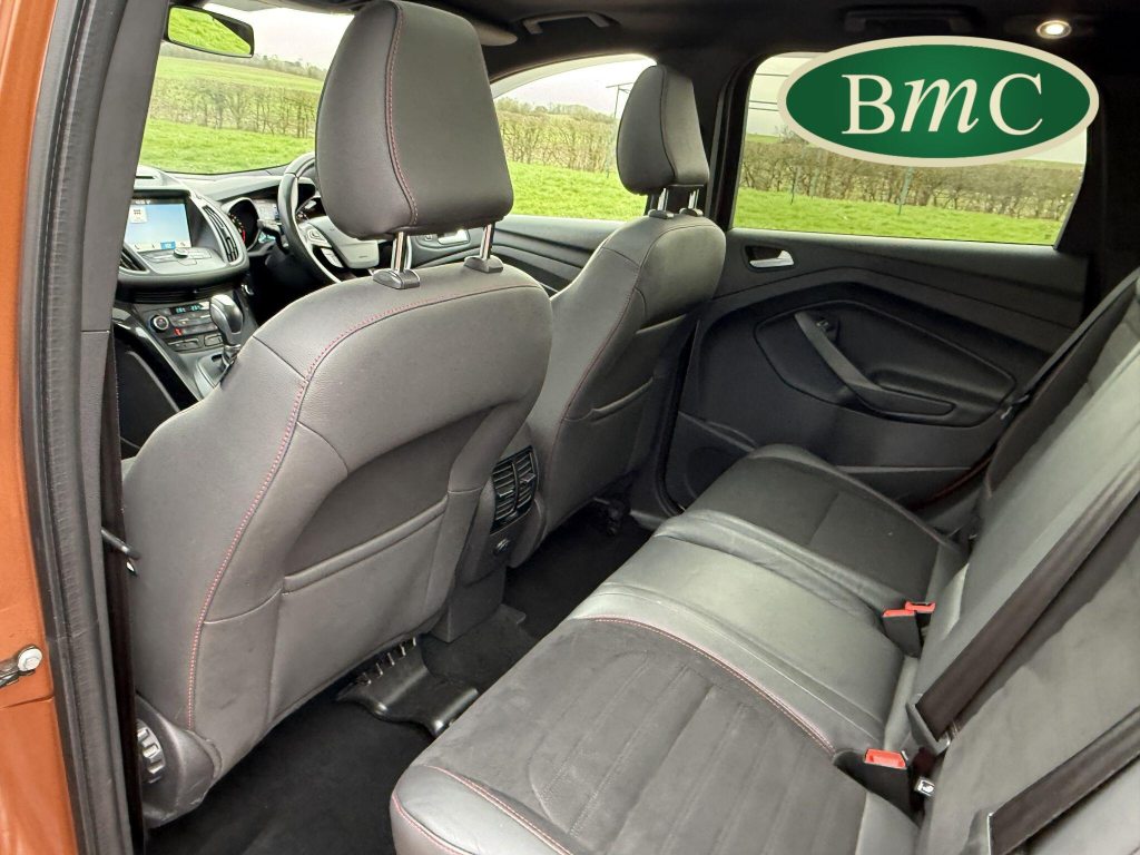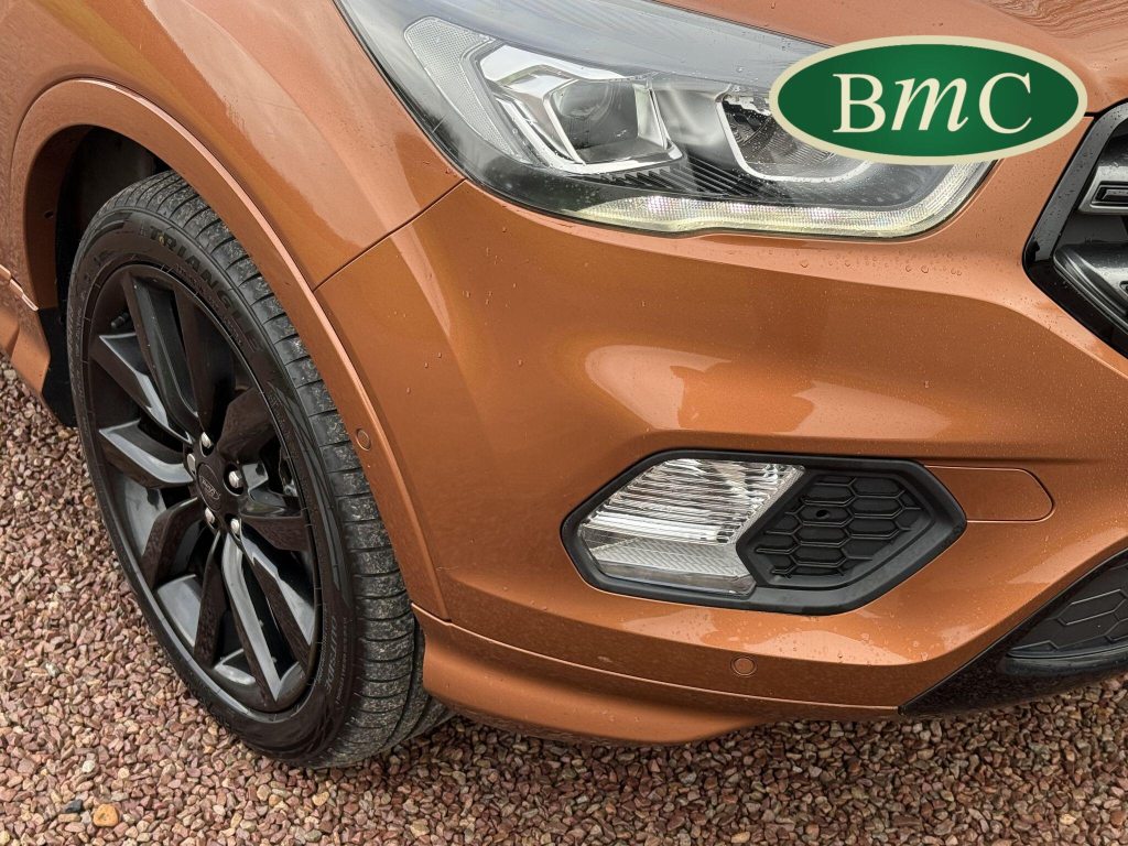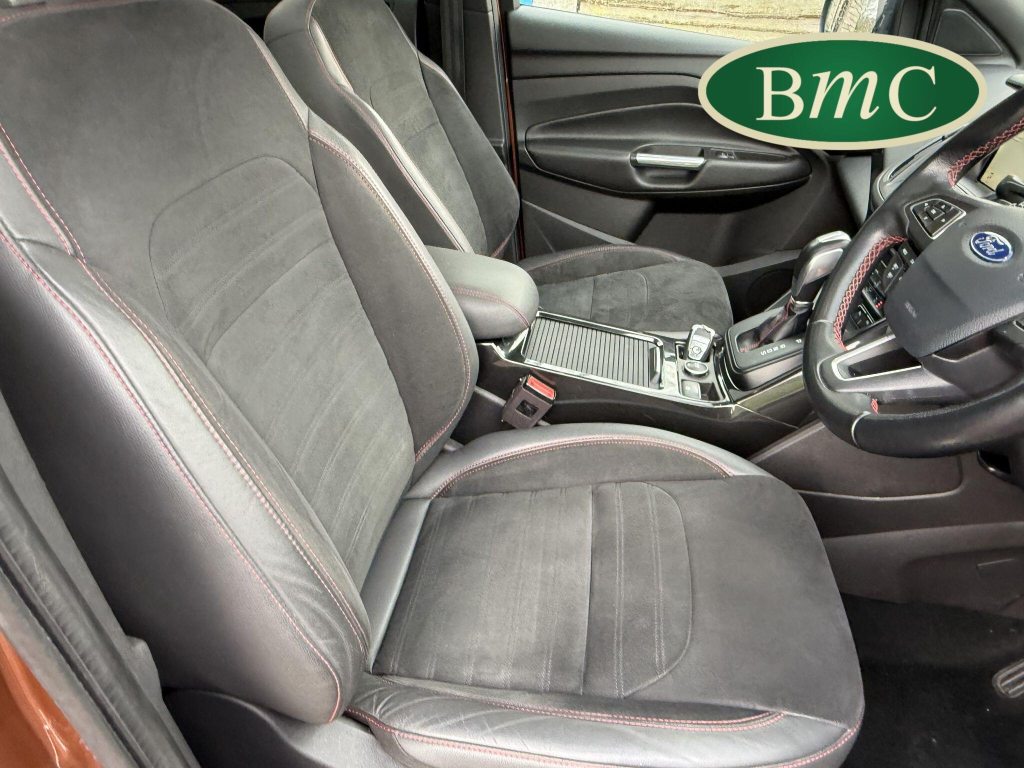 STUNNING COPPER PULSE METALLIC, 8 SERVICES! SERVICED @ 10k, 20k, 28k, 36k, 37k, 48k, 60k & 69k. BOTH KEYS AVAILABLE, FITTED TOW BAR, NAVIGATION SYSTEM, PANORAMIC SUNROOF, PRIVACY GLASS, SPACE SAVER SPARE WHEEL, ANTRACITE ALLOY WHEELS, BLACK ROOF RAILS, FRONT & REAR PARK SENSORS, LOAD COVER, FITTED MATS, BLACK HALF LEATHER SUEDE SEATS WITH RED STITCHING, CRUISE CONTROL, This 2018 Ford Kuga TDCi ST-Line X offers a compelling blend of style and practicality, featuring a robust 2.0L Diesel engine that meets Euro 6 emissions standards. As a 2018 model, it benefits from modern design and technology. The ST-Line X trim level ensures a sporty aesthetic and a host of desirable features, including a power opening panoramic roof that floods the cabin with light, and dual-zone electronic automatic temperature control for personalised comfort.Further enhancing your driving experience, this Kuga comes equipped with the Ford Key Free System, offering keyless entry and a hands-free power tailgate for ultimate convenience. Both front seats feature heated cushions and seat backs, perfect for colder journeys, while rear parking sensors provide added assistance when manoeuvring. This particular model also sits in a low insurance group, indicating it could be a more economical choice for many drivers compared to similar vehicles.