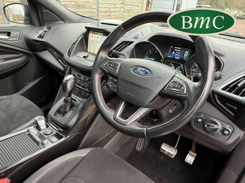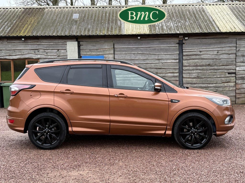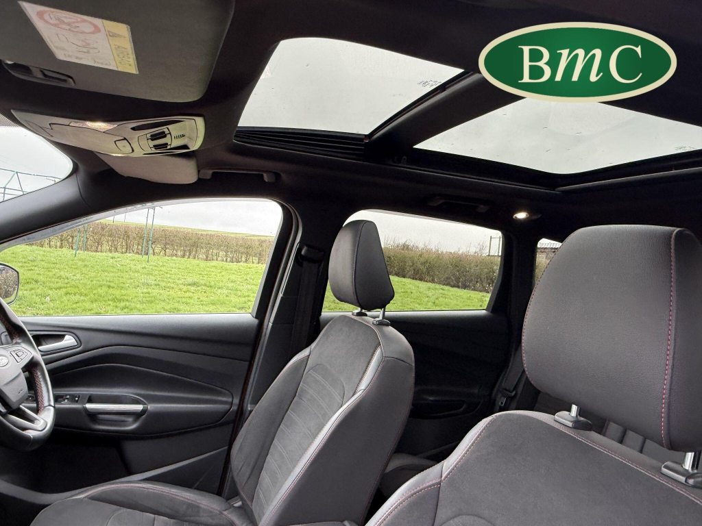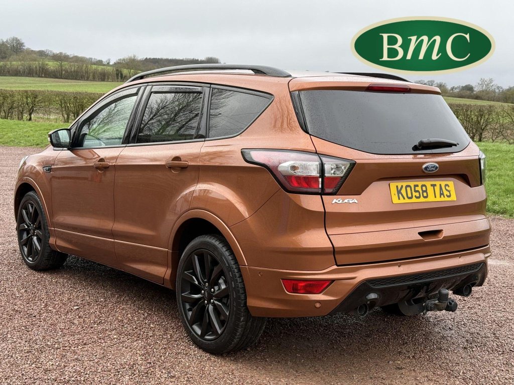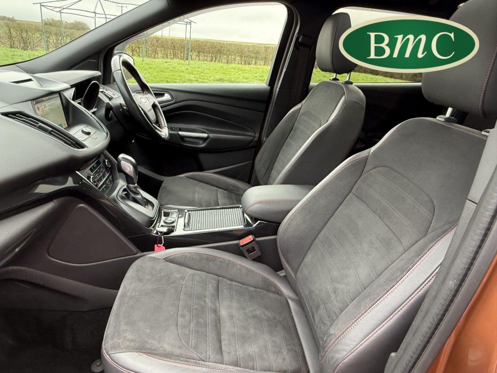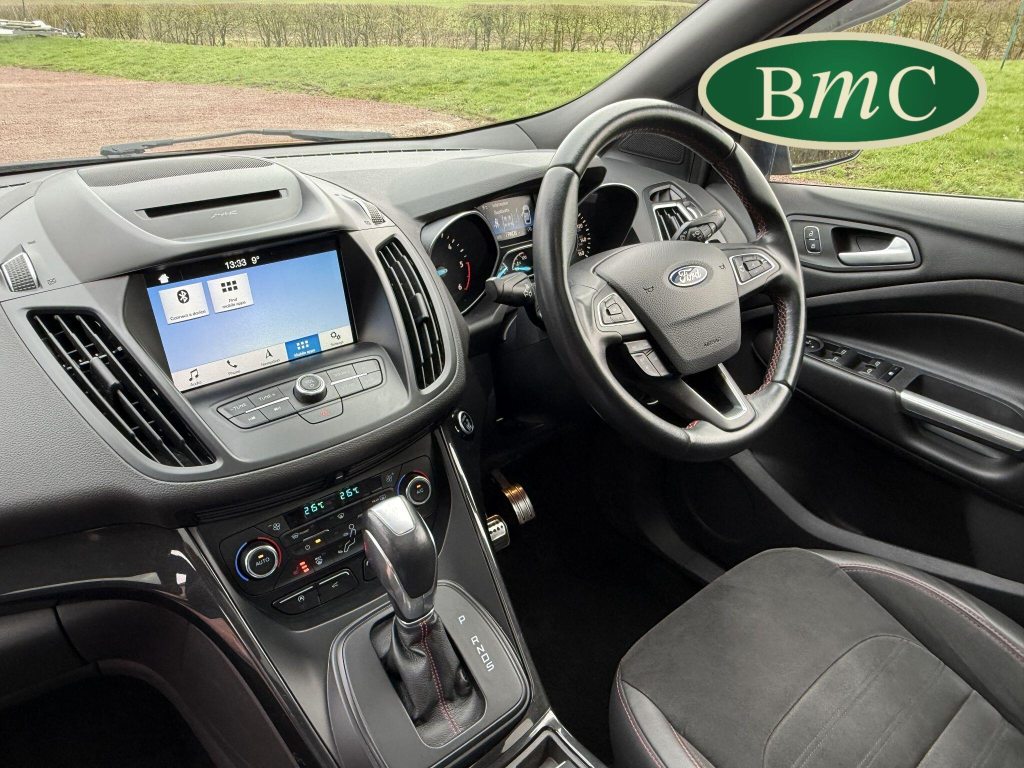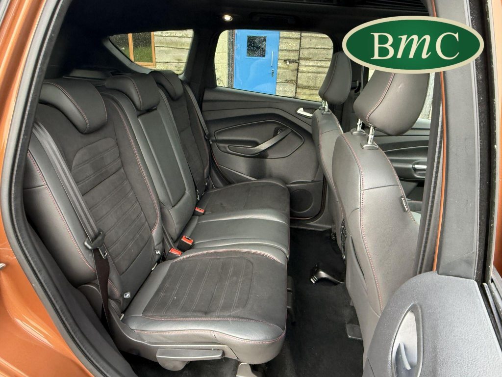 STUNNING COPPER PULSE METALLIC, 8 SERVICES! SERVICED @ 10k, 20k, 28k, 36k, 37k, 48k, 60k & 69k. BOTH KEYS AVAILABLE, FITTED TOW BAR, NAVIGATION SYSTEM, PANORAMIC SUNROOF, PRIVACY GLASS, SPACE SAVER SPARE WHEEL, ANTRACITE ALLOY WHEELS, BLACK ROOF RAILS, FRONT & REAR PARK SENSORS, LOAD COVER, FITTED MATS, BLACK HALF LEATHER SUEDE SEATS WITH RED STITCHING, CRUISE CONTROL, This 2018 Ford Kuga TDCi ST-Line X offers a compelling blend of style and practicality, featuring a robust 2.0L Diesel engine that meets Euro 6 emissions standards. As a 2018 model, it benefits from modern design and technology. The ST-Line X trim level ensures a sporty aesthetic and a host of desirable features, including a power opening panoramic roof that floods the cabin with light, and dual-zone electronic automatic temperature control for personalised comfort.Further enhancing your driving experience, this Kuga comes equipped with the Ford Key Free System, offering keyless entry and a hands-free power tailgate for ultimate convenience. Both front seats feature heated cushions and seat backs, perfect for colder journeys, while rear parking sensors provide added assistance when manoeuvring. This particular model also sits in a low insurance group, indicating it could be a more economical choice for many drivers compared to similar vehicles.