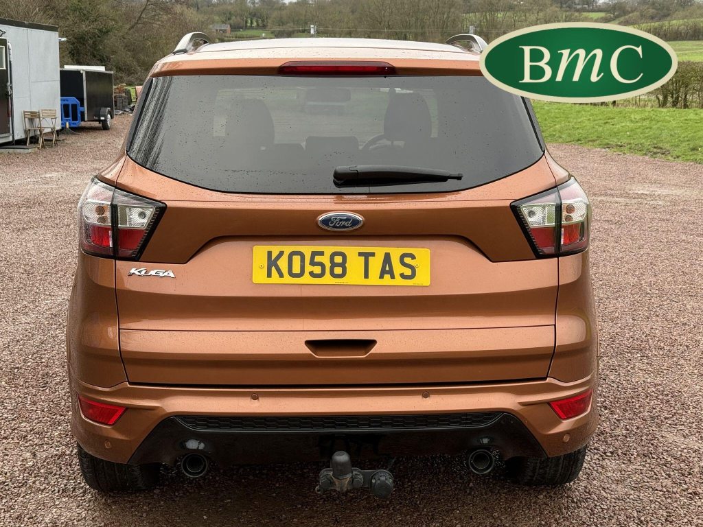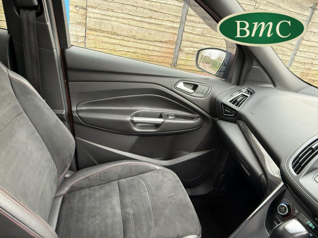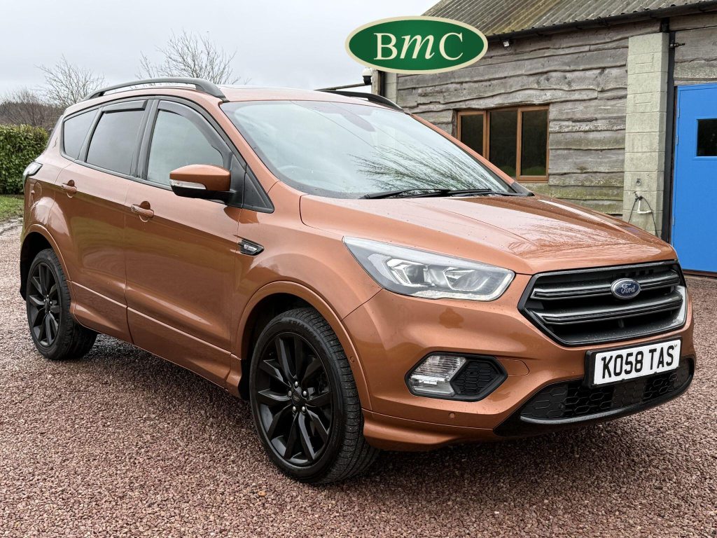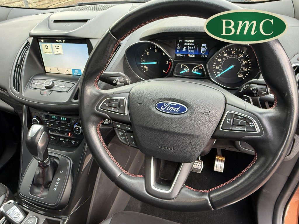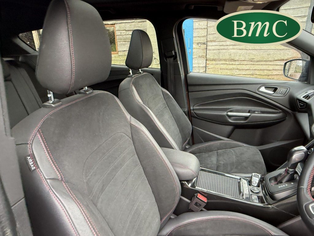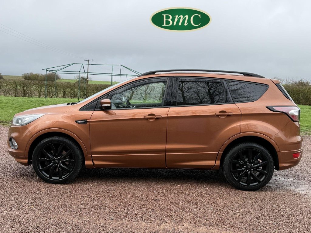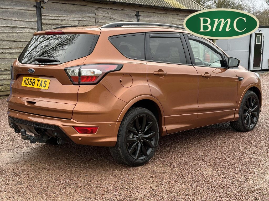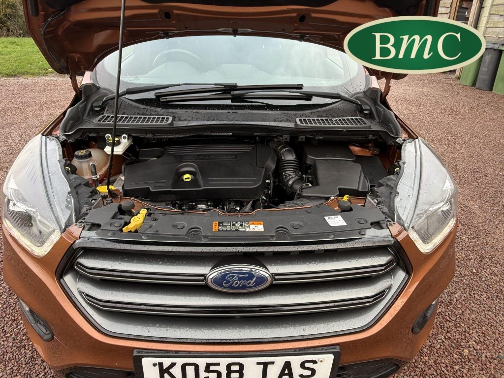 STUNNING COPPER PULSE METALLIC, 8 SERVICES! SERVICED @ 10k, 20k, 28k, 36k, 37k, 48k, 60k & 69k. BOTH KEYS AVAILABLE, FITTED TOW BAR, NAVIGATION SYSTEM, PANORAMIC SUNROOF, PRIVACY GLASS, SPACE SAVER SPARE WHEEL, ANTRACITE ALLOY WHEELS, BLACK ROOF RAILS, FRONT & REAR PARK SENSORS, LOAD COVER, FITTED MATS, BLACK HALF LEATHER SUEDE SEATS WITH RED STITCHING, CRUISE CONTROL, This 2018 Ford Kuga TDCi ST-Line X offers a compelling blend of style and practicality, featuring a robust 2.0L Diesel engine that meets Euro 6 emissions standards. As a 2018 model, it benefits from modern design and technology. The ST-Line X trim level ensures a sporty aesthetic and a host of desirable features, including a power opening panoramic roof that floods the cabin with light, and dual-zone electronic automatic temperature control for personalised comfort.Further enhancing your driving experience, this Kuga comes equipped with the Ford Key Free System, offering keyless entry and a hands-free power tailgate for ultimate convenience. Both front seats feature heated cushions and seat backs, perfect for colder journeys, while rear parking sensors provide added assistance when manoeuvring. This particular model also sits in a low insurance group, indicating it could be a more economical choice for many drivers compared to similar vehicles.
