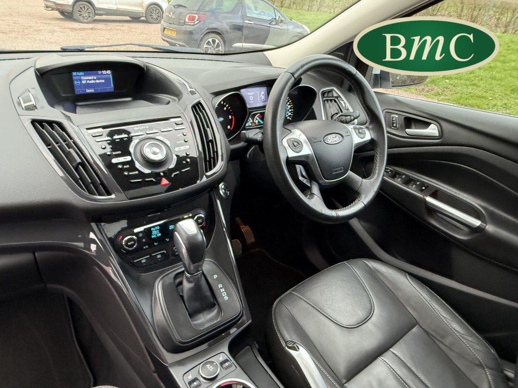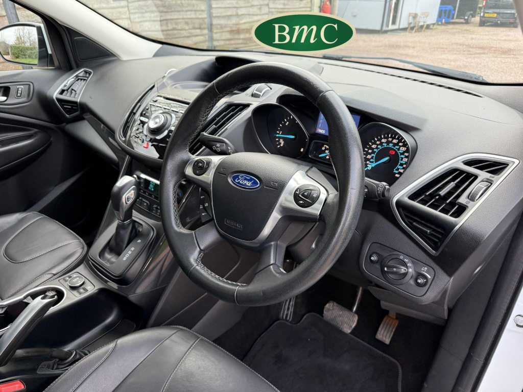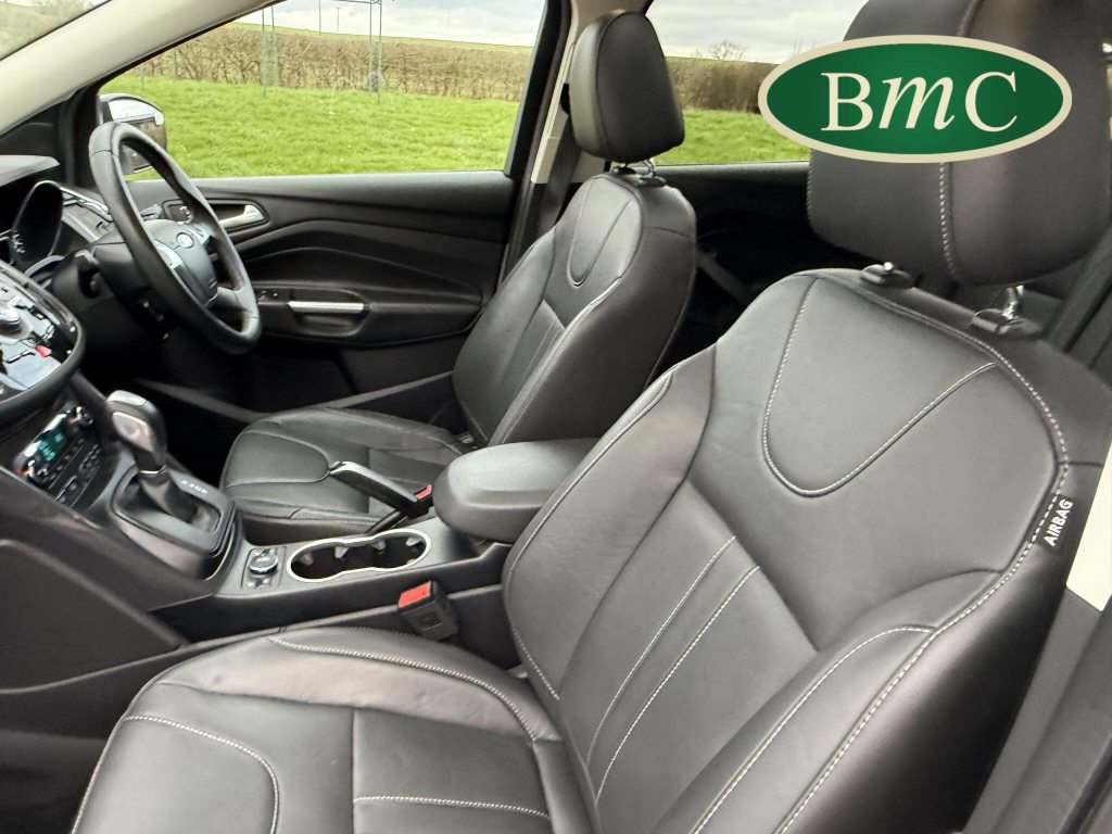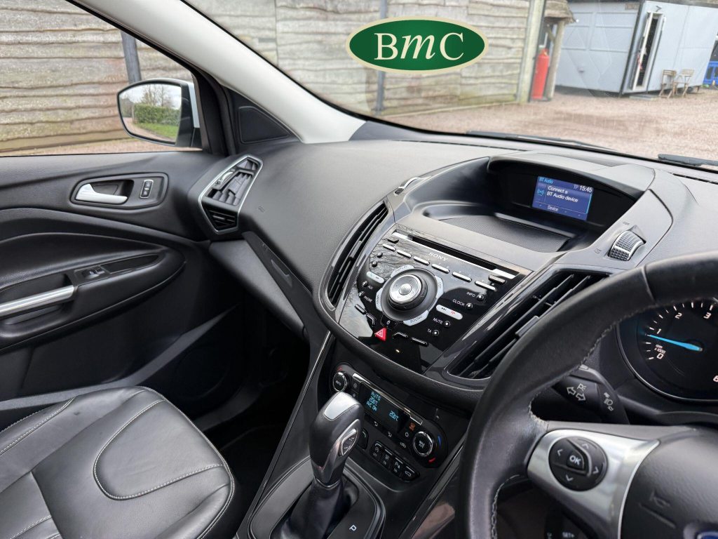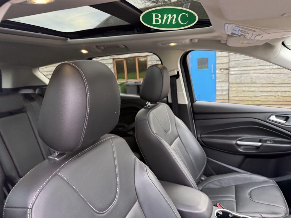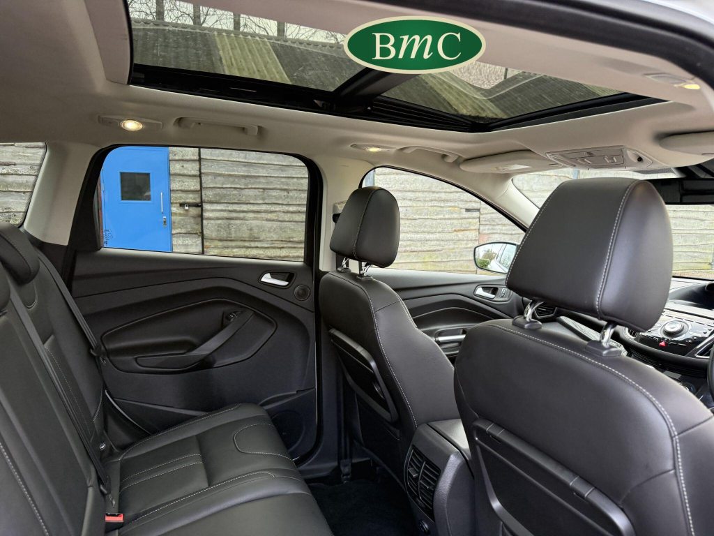 SERVICED @ 5K, 9K, 14K, 24K, 30K, 38K, 46K, 55K, 64K & 72K MILES.This 2015 Ford Kuga TDCi Titanium X presents a remarkable opportunity with its exceptionally low mileage of just 73,000 miles for its age. This Four Wheel Drive model is powered by an efficient 2.0L Diesel engine, meeting Euro 6 emissions standards. It boasts the desirable Titanium X trim, enhanced by the Convenience Pack which includes front parking sensors, and the Appearance Pack. Further adding to its appeal are the automatic headlights and a fixed panorama roof with a panoramic sunroof, alongside heated driver and passenger seats for added comfort.The Kuga TDCi Titanium X offers an impressive fuel economy of 52 miles per gallon, a figure that highlights its efficiency compared to many other vehicles in its class. The inclusion of the Convenience Pack with parking assistance and the automatic headlights demonstrate thoughtful features designed to make driving and parking easier. Combined with the comfort of heated seats and the expansive feel provided by the panorama roof, this Ford Kuga is a well equipped and economical choice for those seeking a capable and comfortable SUV.