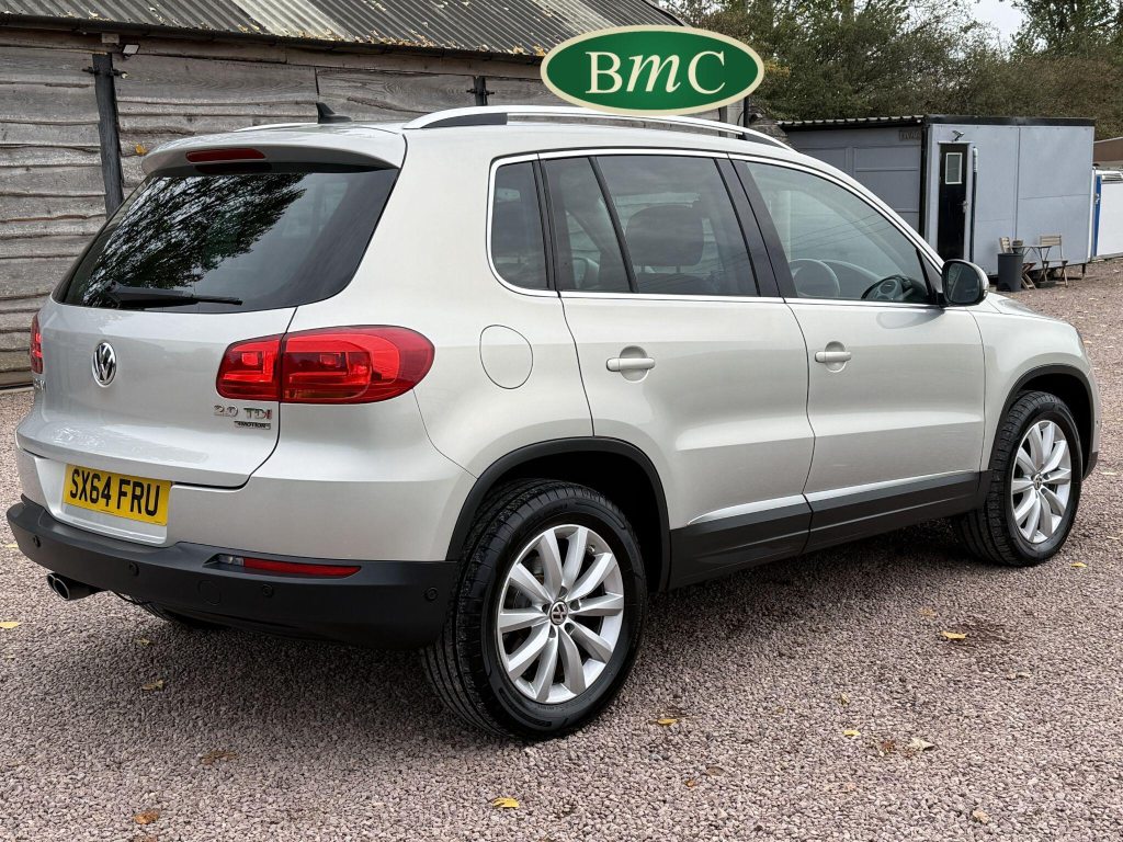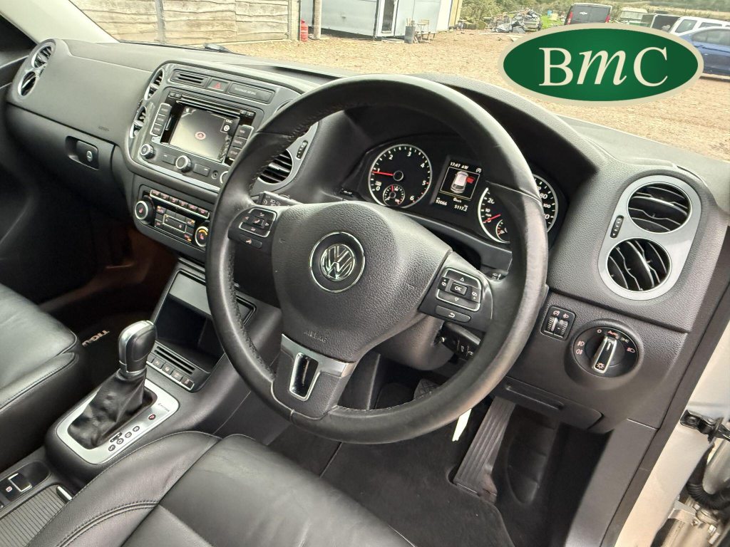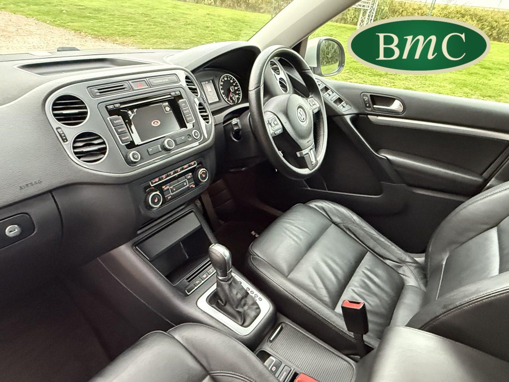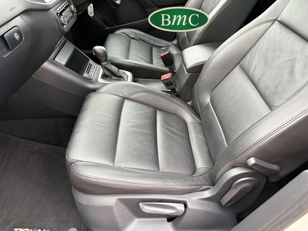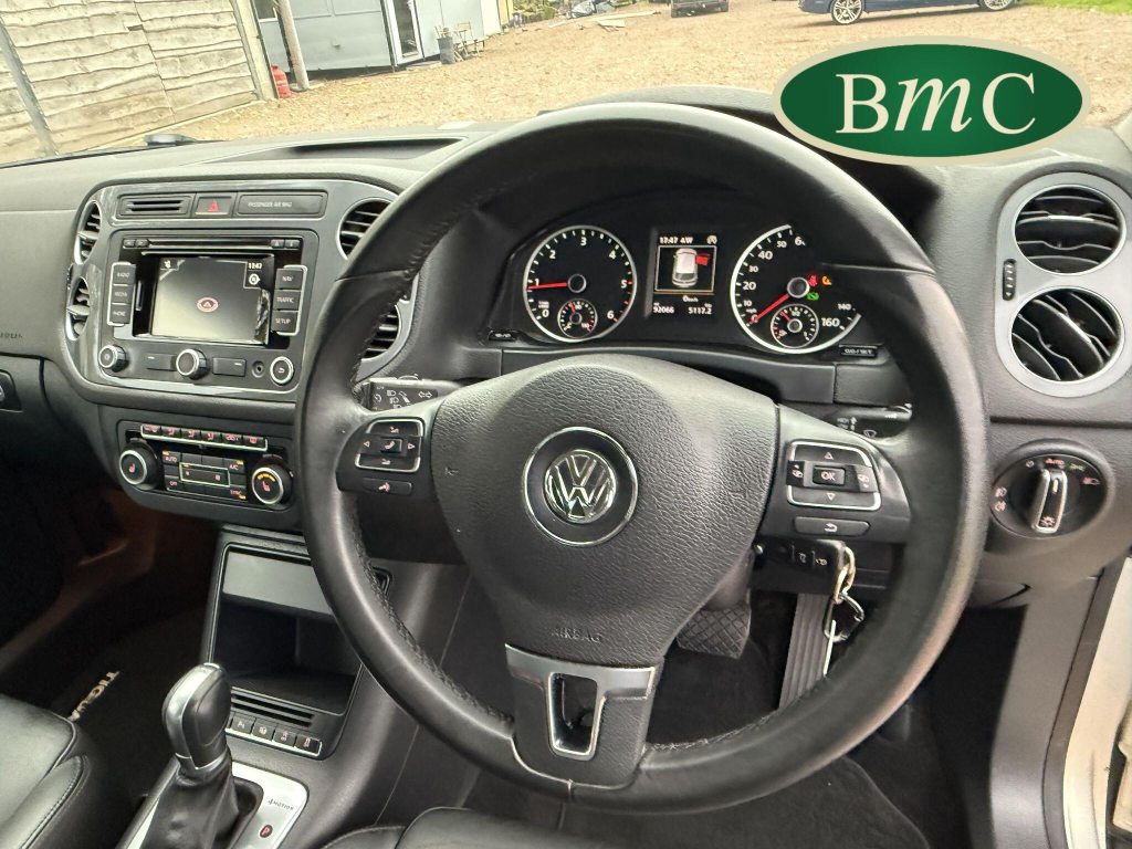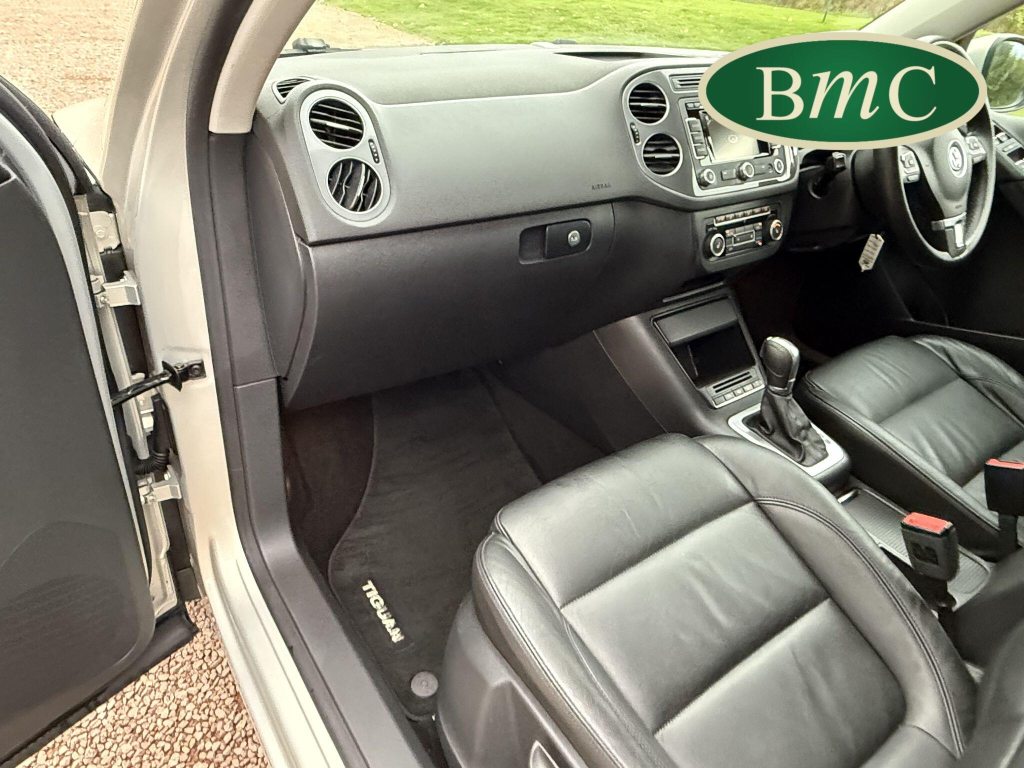 SERVICED AT 9K, 19K,28K, 38K, 45K, 52K, 58K (CAM BELT & WATER PUMP), 61K,67K, 72K, 77K & 92K MILES, JUST SERVICED HERE @ BMC. FULL MOT.BOTH KEYS. VW FITTED RETRACTABLE TOW BAR, BLACK LEATHER HEATED ELECTRIC HEATED SEATS, CRUISE CONTROL, SATELLITE NAVIGATION, DAB DIGITAL RADIO, BLUETOOTH, SELF PARKING ASSISTANT, TYRE PRESSURE MONITORING, FRONT & REAR PARK SENSORS, PRIVACY GLASS, SUPERB EXAMPLE!This 2014 Volkswagen Tiguan TDI Match offers excellent peace of mind with its MOT valid until November 2025. This capable Four Wheel Drive SUV is powered by an efficient 2.0 litre diesel engine and boasts a generous towing weight of 2500 kg, making it a versatile choice for various needs. Inside, you'll find a comfortable and convenient cabin featuring Bluetooth telephone preparation for seamless connectivity, 2 zone electronic climate control for personalised comfort, and a dusk sensor for automatic headlights.The Tiguan TDI Match is further enhanced by its advanced parking systems, including front and rear parking sensors and Park Assist, which simplify manoeuvring in tight spaces. These features, along with the automatic driving lights, demonstrate a higher level of specification compared to many similar vehicles. The impressive 0-62mph acceleration in just 8.5 seconds highlights the responsive performance of this well equipped Volkswagen.