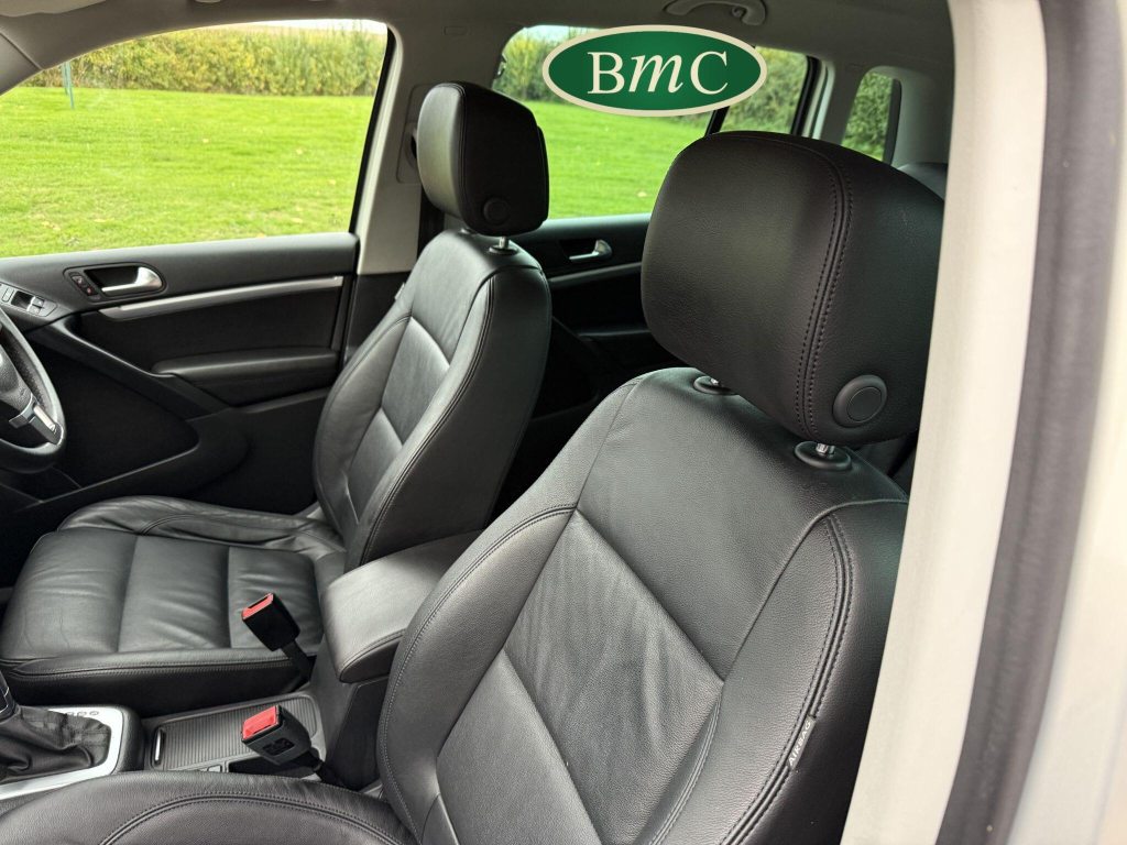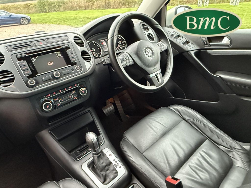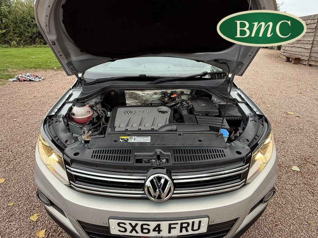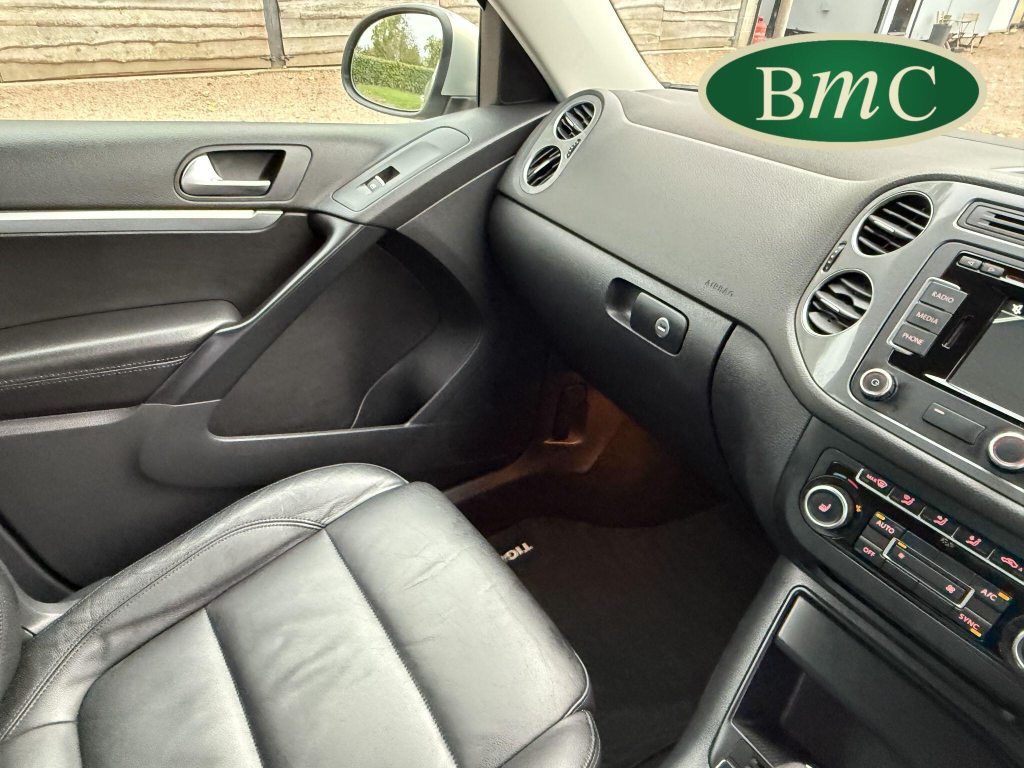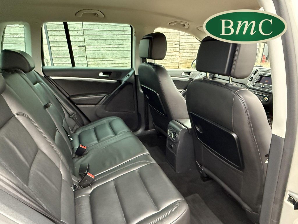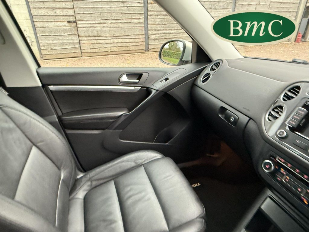 SERVICED AT 9K, 19K,28K, 38K, 45K, 52K, 58K (CAM BELT & WATER PUMP), 61K,67K, 72K, 77K & 92K MILES, JUST SERVICED HERE @ BMC. FULL MOT.BOTH KEYS. VW FITTED RETRACTABLE TOW BAR, BLACK LEATHER HEATED ELECTRIC HEATED SEATS, CRUISE CONTROL, SATELLITE NAVIGATION, DAB DIGITAL RADIO, BLUETOOTH, SELF PARKING ASSISTANT, TYRE PRESSURE MONITORING, FRONT & REAR PARK SENSORS, PRIVACY GLASS, SUPERB EXAMPLE!This 2014 Volkswagen Tiguan TDI Match offers excellent peace of mind with its MOT valid until November 2025. This capable Four Wheel Drive SUV is powered by an efficient 2.0 litre diesel engine and boasts a generous towing weight of 2500 kg, making it a versatile choice for various needs. Inside, you'll find a comfortable and convenient cabin featuring Bluetooth telephone preparation for seamless connectivity, 2 zone electronic climate control for personalised comfort, and a dusk sensor for automatic headlights.The Tiguan TDI Match is further enhanced by its advanced parking systems, including front and rear parking sensors and Park Assist, which simplify manoeuvring in tight spaces. These features, along with the automatic driving lights, demonstrate a higher level of specification compared to many similar vehicles. The impressive 0-62mph acceleration in just 8.5 seconds highlights the responsive performance of this well equipped Volkswagen.