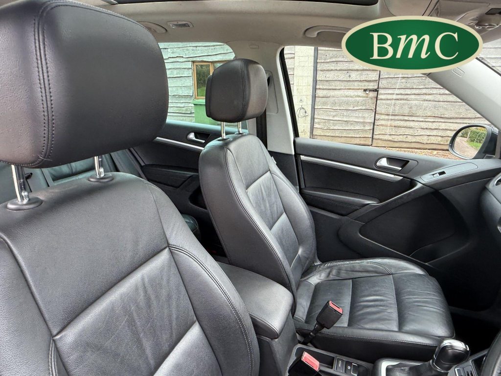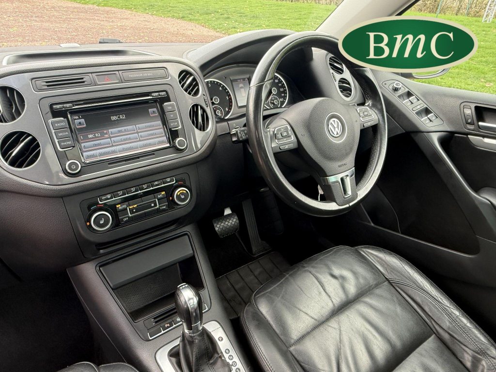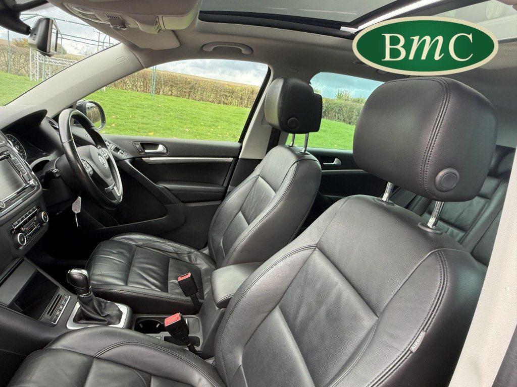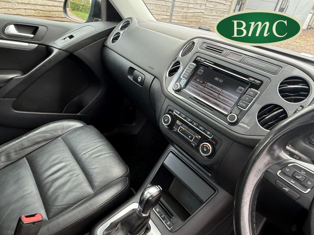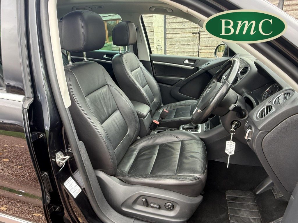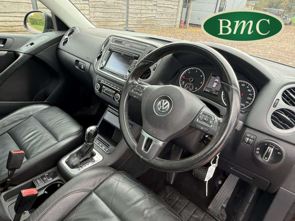 SERVICED @ 4K, 11K, 14K, 18K, 21K, 28K, 31K, 36K, 38K, 41K & 46K MILES. GREAT SERVICE HISTORY. 2 OWNERS FROM NEW. BOTH REMOTE KEYS. PANORAMIC SUNROOF. BLACK LEATHER HEATED ELECTRC TRIM, REVERSE CAMERA, BLUETOOTH, PRIVACY GLASS, CRUISE CONTROL, SPACE SAVER SPARE WHEEL, SELF PARKING ASSISTANT, FRONT & REAR PARK SENSORS, STUNNING EXAMPLE!Boasting exceptionally low mileage for its age, this 2012 Volkswagen Tiguan TDI SE presents a superb ownership proposition. With only two previous owners and a mere 49,000 miles on the clock, this four wheel drive model is powered by an efficient 2.0 litre diesel engine. Its MOT is valid until April 2026, and it was last serviced on 2nd April 2025 at 46,017 miles, underscoring its excellent provenance. Inside, you'll find luxurious Vienna Leather upholstery in Titan Black, a panoramic sunroof that opens up the cabin, and a Winter Pack featuring heated seats for added comfort. Practicality is enhanced by cruise control and park assist, complete with front and rear parking sensors.This Tiguan TDI SE is also equipped to handle your towing needs, with a towing weight of 2500 kg. Its low insurance group rating further adds to its appeal, suggesting lower running costs compared to similar vehicles. The combination of its comprehensive service history, minimal owner count, and desirable features like the panoramic sunroof and Vienna leather, clearly sets this Volkswagen Tiguan apart from others on the market.