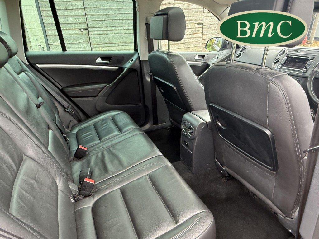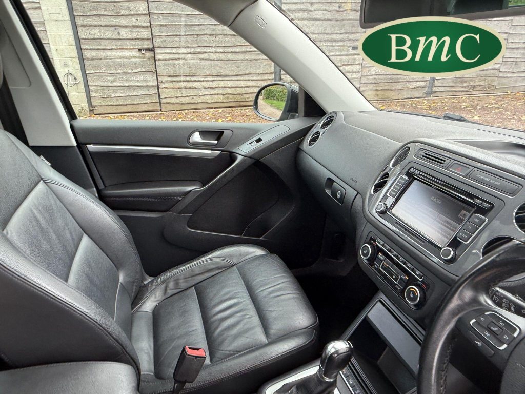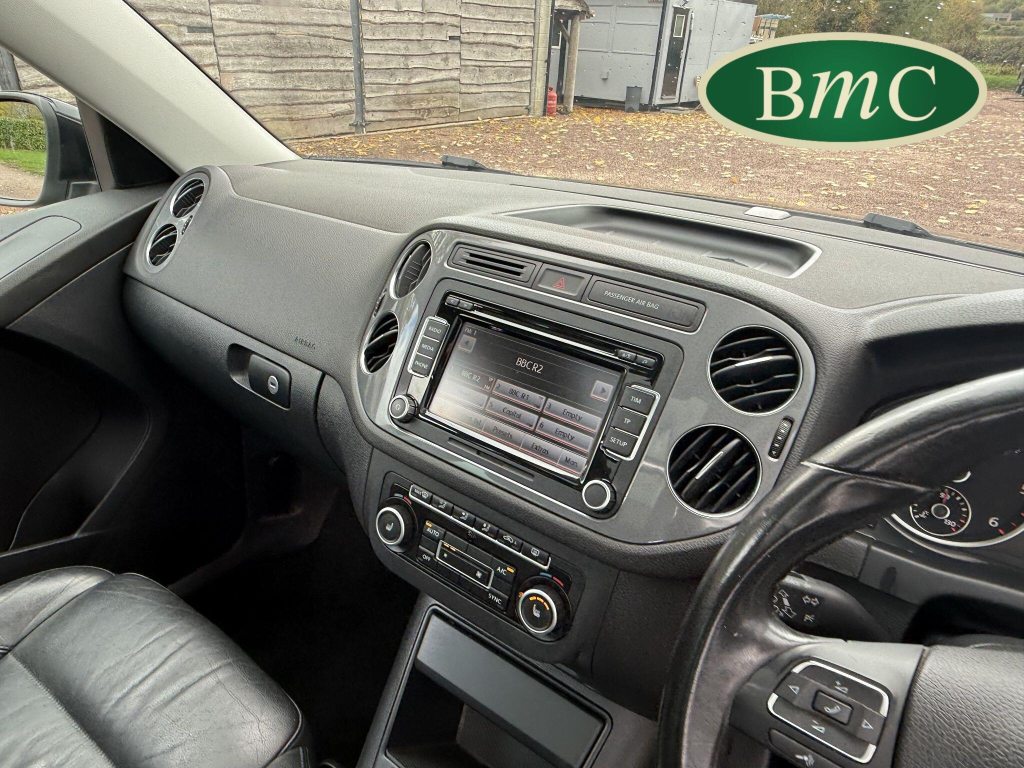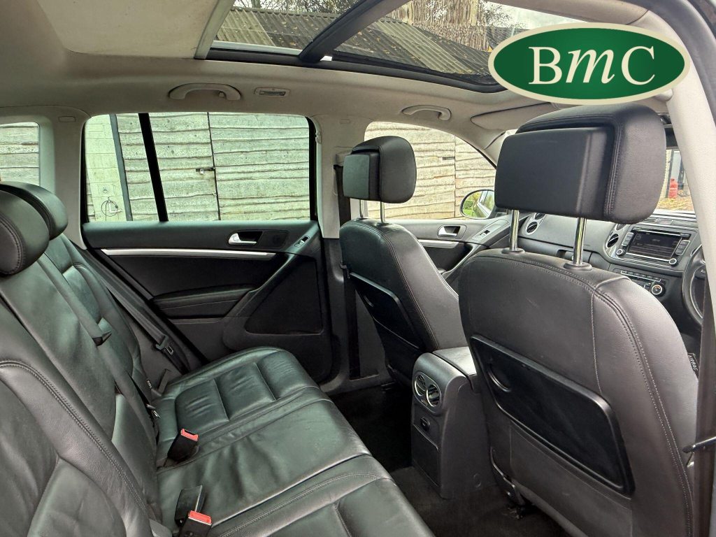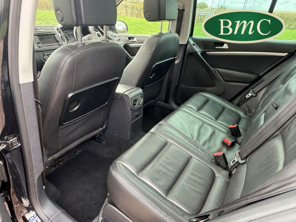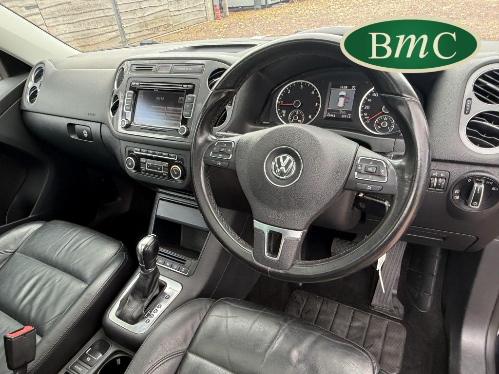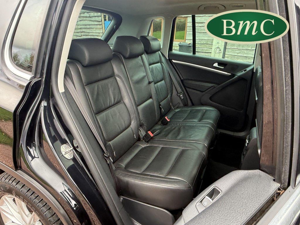 SERVICED @ 4K, 11K, 14K, 18K, 21K, 28K, 31K, 36K, 38K, 41K & 46K MILES. GREAT SERVICE HISTORY. 2 OWNERS FROM NEW. BOTH REMOTE KEYS. PANORAMIC SUNROOF. BLACK LEATHER HEATED ELECTRC TRIM, REVERSE CAMERA, BLUETOOTH, PRIVACY GLASS, CRUISE CONTROL, SPACE SAVER SPARE WHEEL, SELF PARKING ASSISTANT, FRONT & REAR PARK SENSORS, STUNNING EXAMPLE!Boasting exceptionally low mileage for its age, this 2012 Volkswagen Tiguan TDI SE presents a superb ownership proposition. With only two previous owners and a mere 49,000 miles on the clock, this four wheel drive model is powered by an efficient 2.0 litre diesel engine. Its MOT is valid until April 2026, and it was last serviced on 2nd April 2025 at 46,017 miles, underscoring its excellent provenance. Inside, you'll find luxurious Vienna Leather upholstery in Titan Black, a panoramic sunroof that opens up the cabin, and a Winter Pack featuring heated seats for added comfort. Practicality is enhanced by cruise control and park assist, complete with front and rear parking sensors.This Tiguan TDI SE is also equipped to handle your towing needs, with a towing weight of 2500 kg. Its low insurance group rating further adds to its appeal, suggesting lower running costs compared to similar vehicles. The combination of its comprehensive service history, minimal owner count, and desirable features like the panoramic sunroof and Vienna leather, clearly sets this Volkswagen Tiguan apart from others on the market.